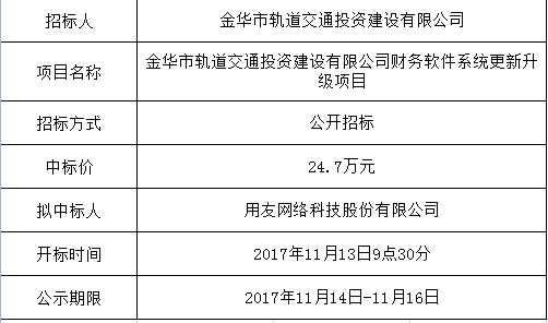 金華市軌道交通投資建設(shè)有限公司財務(wù)軟件系統(tǒng)更新升級項目中標(biāo)公示