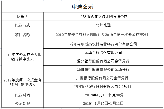 金華市軌道交通集團(tuán)有限公司2019年度資金存放入圍銀行及2019年第一次資金存放項(xiàng)目