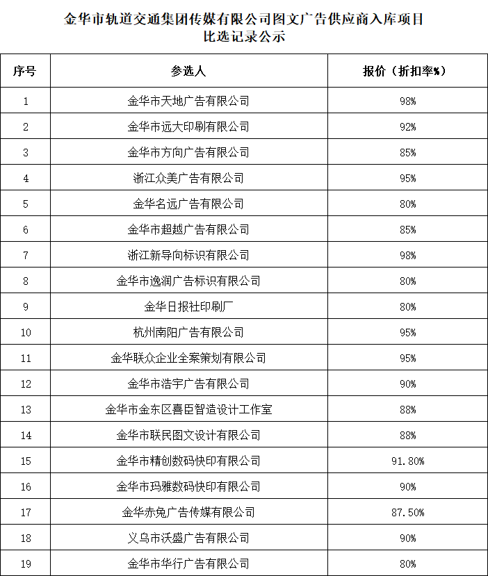 金華市軌道交通集團傳媒有限公司圖文廣告供應商入庫項目比選記錄、中選公示