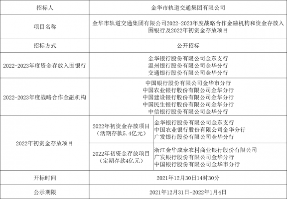 金華市軌道交通集團有限公司2022-2023年度戰(zhàn)略合作金融機構(gòu)和資金存放入圍銀行及2022年初資金存放項目中標(biāo)公示