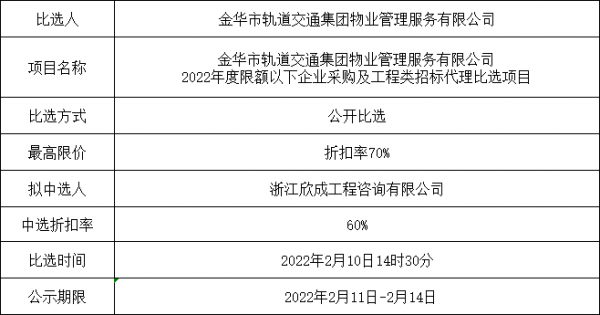 金華市軌道交通集團(tuán)物業(yè)管理服務(wù)有限公司2022年度限額以下企業(yè)采購(gòu)及工程類招標(biāo)代理比選項(xiàng)目中選公示