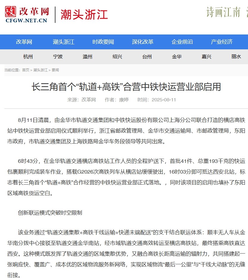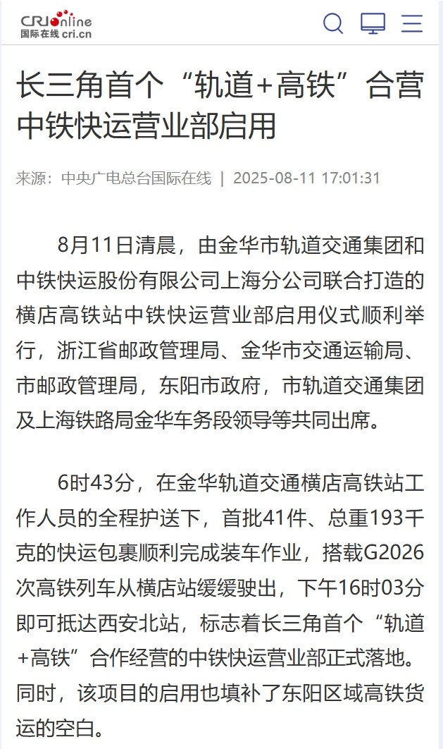 8月11日,長(zhǎng)三角首個(gè)“軌道+高鐵”合營(yíng)中鐵快運(yùn)營(yíng)業(yè)部啟用。該營(yíng)業(yè)部將串聯(lián)金義東市域軌道交通全線站點(diǎn)形成收攬網(wǎng)絡(luò),在全線31座車(chē)站均可辦理業(yè)務(wù),通過(guò)軌道交通集中收攬分撥后接入全國(guó)高鐵物流網(wǎng)。